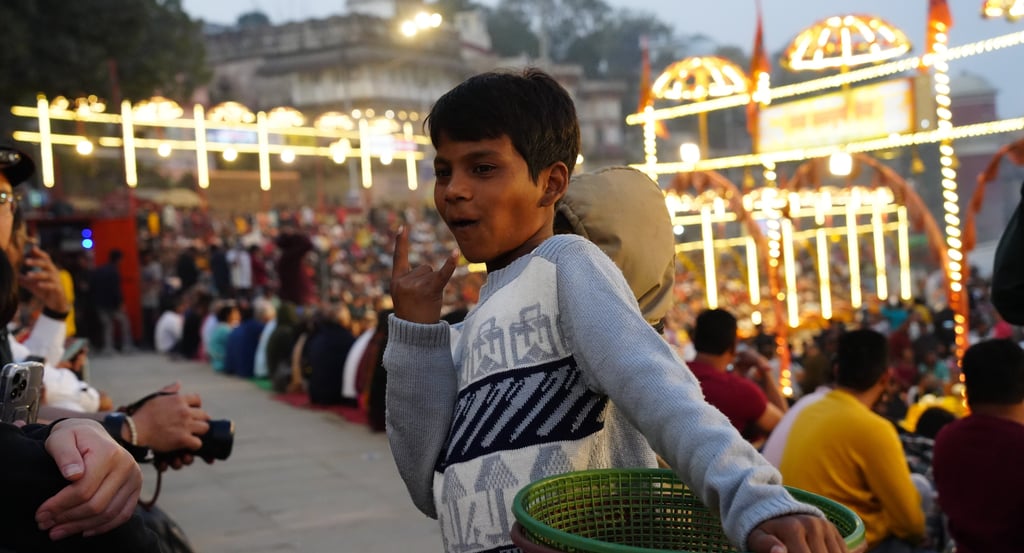 恆河3000年歷史的夜祭,是每個來Varanasi的旅人不能錯過的。夜祭現場有許多兜售祭祀用花的小朋友,他們大多穿著不太合身的衣褲、頭髮和臉頰滿是污漬,但卻掛著燦爛的笑容。一位弟弟蹦跳過來,把他的產品湊到我們眼前,好奇心和善心促使我們買了四個(一個也才20盧比,大概10塊台幣以內),這時候與弟弟同行的男孩跑過來,委屈巴巴的說他剛剛也有跟我們介紹,正當我們猶豫是否要再掏錢時,弟弟竟然毫不猶豫的把已經收進口袋的錢分了一半給朋友,表示:兩個買你的,兩個買我的。