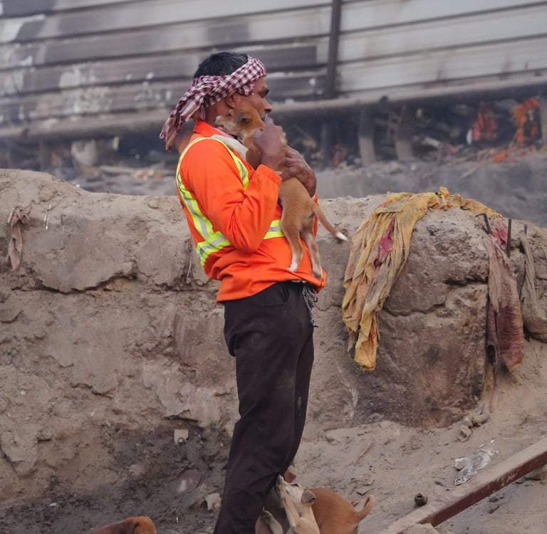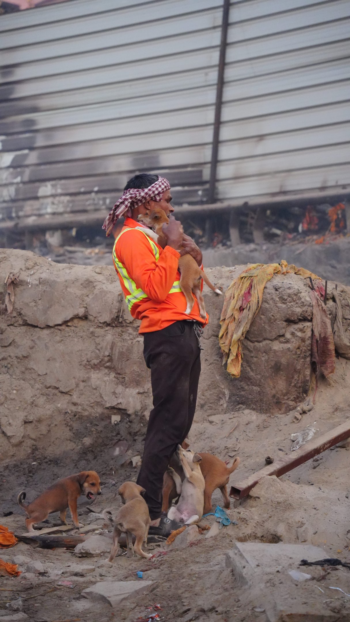 這天天未亮,我們迷路在晦暗潮濕的巷弄,被人引導到火場高處勒索善款,超近距離看到即將火化的屍體,正當身心被劇烈衝擊、疲憊不堪時,一個畫面深深治癒我們:一個男子溫柔地將一隻小奶狗捧在臉頰旁,眉目間滿溢出來的疼惜與關愛。